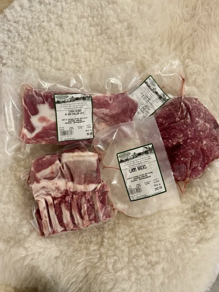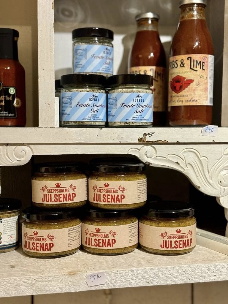I gårdsbutiken erbjuder vi kött och delikatesser från gårdens lamm och utegrisar samt vilt från egen och lokala producenters mark. Egentillverkad/ lokalproducerad saft och sylt, marinader, kryddor och hemlagad senap efter oldemors recept.